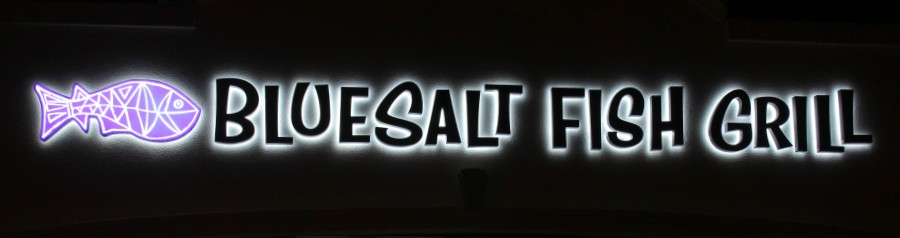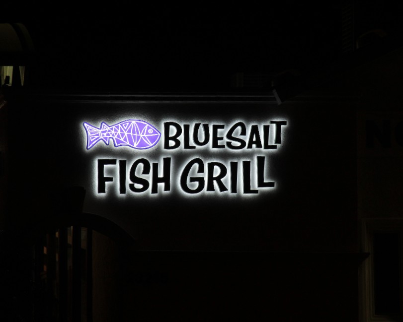 Blue Salt Fish Grill is located in Torrance California. It is an eatery serving up a variety of grilled seafood choices, salads, and tacos. This sign features reverse channel letters with a custom LED illuminated logo box.